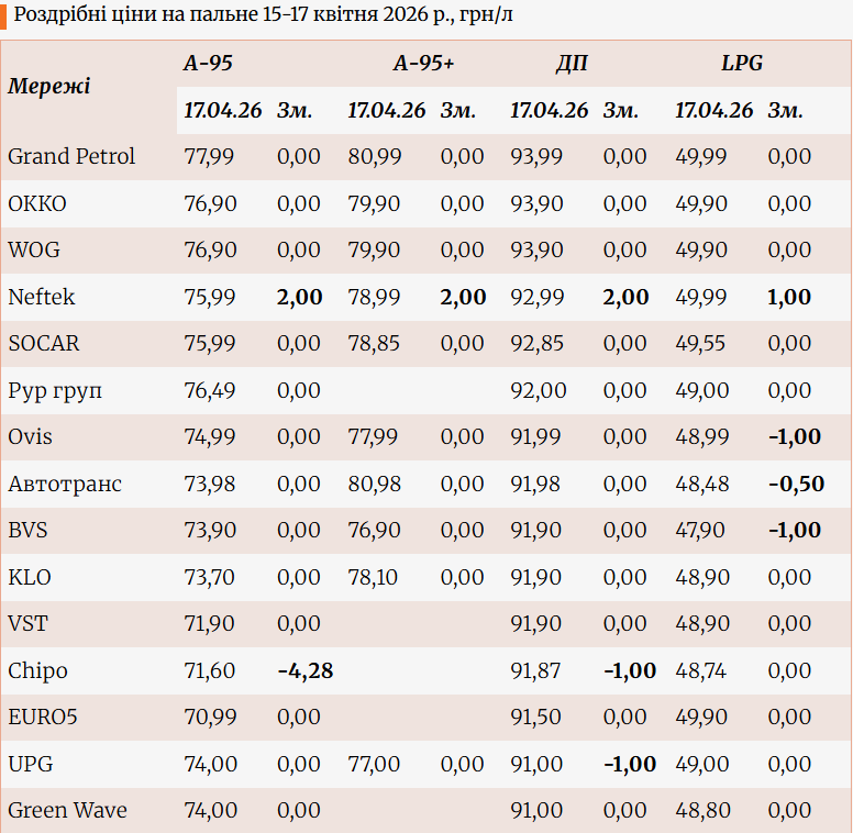 Водночас упродовж 16–17 квітня роздрібні ціни також пішли вниз: бензин А-95 і дизпаливо подешевшали на 14 коп./л — до 73,01 грн/л і 91,25 грн/л відповідно.