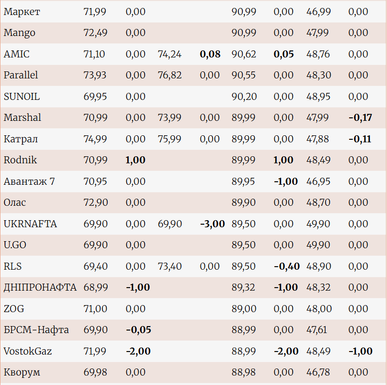 Окремі мережі вже активніше коригують вартість. Так, на 1 грн/л зменшили ціни на дизельне пальне UPG (до 91 грн/л), Chipo (91,87 грн/л) та "Авантаж 7" (89,95 грн/л), а криворізька мережа RLS опустила ціну на 40 коп./л — до 89,50 грн/л.