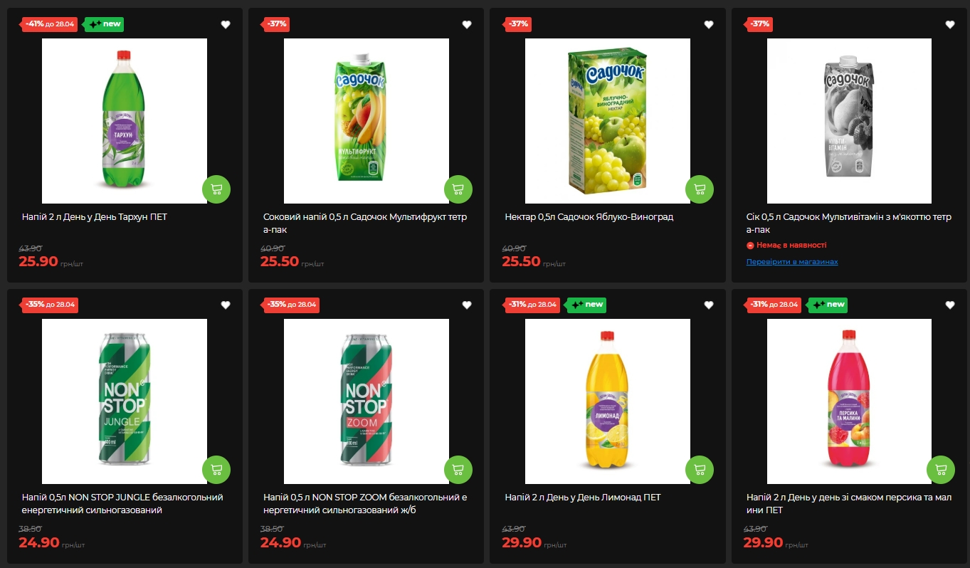 Серед напоїв найбільша знижка — на "День у День" Тархун 2 л: 25,90 грн замість 43,90 грн (-41%). Лимонад 2 л та напій зі смаком персика і малини 2 л — по 29,90 грн замість 43,90 грн (-31%).