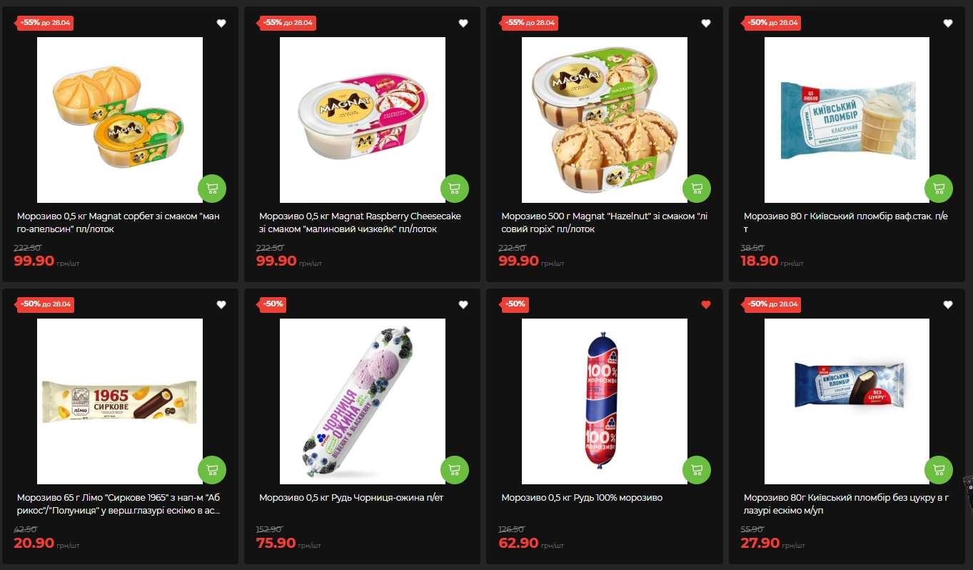 Найагресивніші знижки цього тижня — у відділі заморозки. Морозиво Magnat у трьох смаках — манго-апельсин, малиновий чизкейк і лісовий горіх — коштує 99,90 грн за 500 г замість 222,50 грн. Знижка — мінус 55%. Стільки само дисконту діє на морозиво "Київський пломбір", "Лімо", Рудь та Laska.