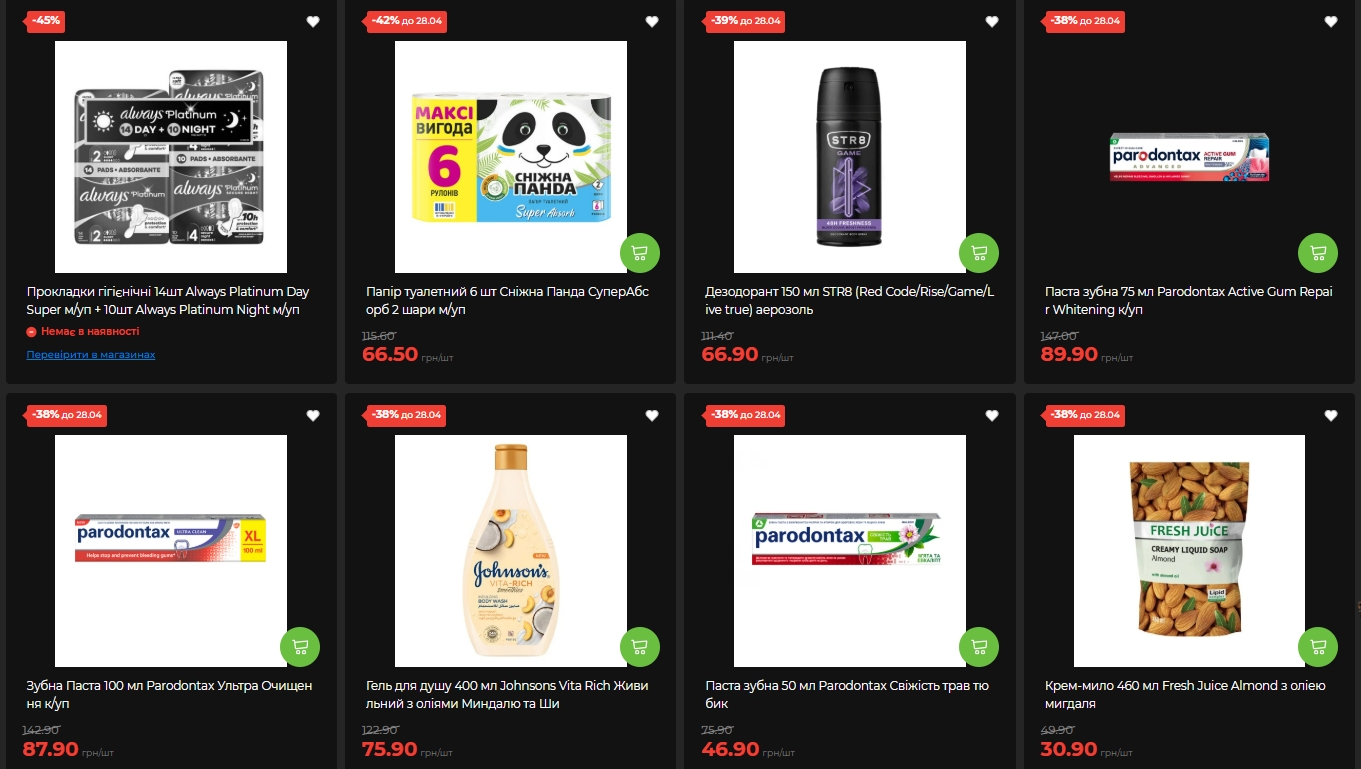 Гель для душу Johnsons Vita Rich з оліями мигдалю та ші, 400 мл — 75,90 грн замість 122,90 грн (-38%). Дезодорант STR8 аерозоль 150 мл — 66,90 грн замість 111,40 грн (-39%). Папір туалетний Zewa Deluxe 4 рулони — 95,90 грн замість 153,90 грн (-37%). Гель для душу Dove 250 мл — 72,90 грн замість 111,30 грн (-34%).