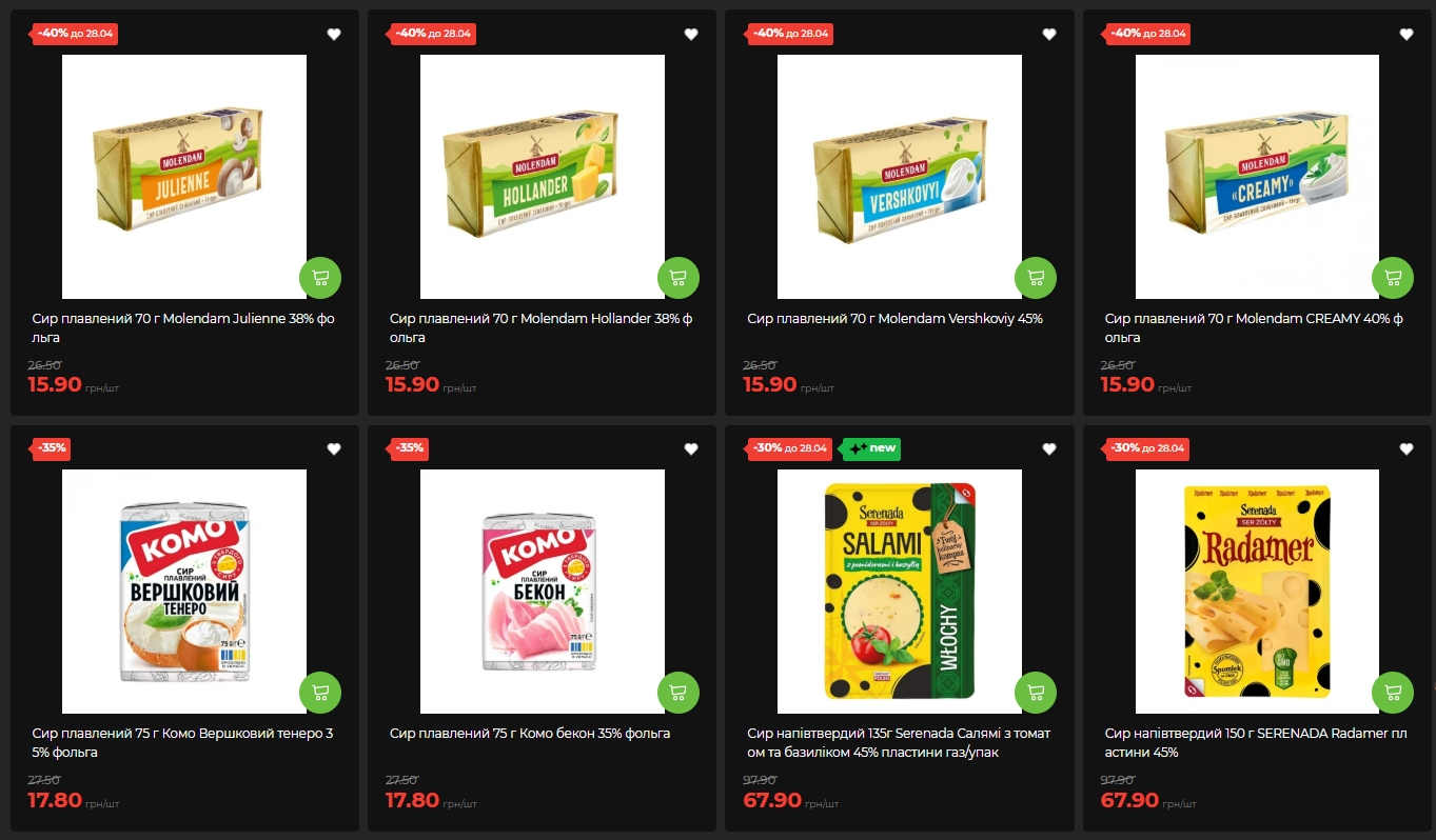 Серед молочних продуктів найбільший дисконт — у плавлених сирів. Сир плавлений Molendam чотирьох видів — Julienne, Hollander, Vershkoviy і Creamy, по 70 г — коштує 15,90 грн замість 26,50 грн. Знижка — мінус 40% до 28 квітня.
