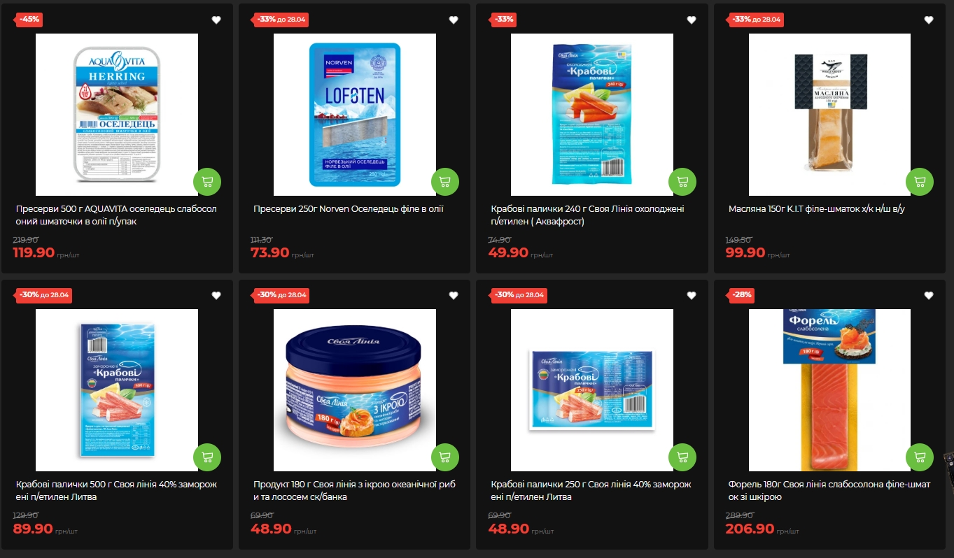 Масляна K.I.T холодного копчення, 150 г — 99,90 грн замість 149,50 грн (-33%). Пресерви Norven — оселедець філе в олії, 250 г — 73,90 грн замість 111,30 грн. Крабові палички "Своя Лінія" охолоджені 240 г — 49,90 грн замість 74,90 грн. Заморожені крабові палички 500 г — 89,90 грн замість 129,90 грн (-30%).