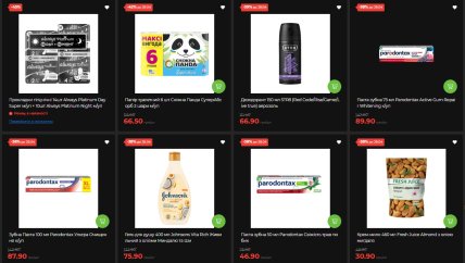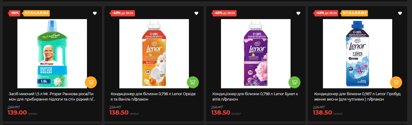 У відділі побутової хімії та гігієни є позиції зі знижкою навіть у 50%. Засіб Mr. Proper рідкий для прибирання підлоги і стін, 1,5 л — 139,00 грн замість 280,00 грн (-50%).