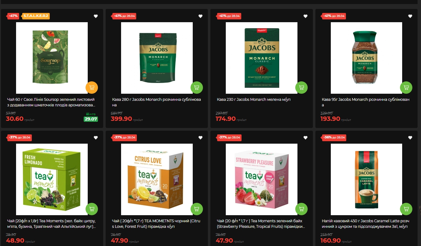 Відділ кави і чаю — приємна несподіванка. Кава Jacobs Monarch розчинна сублімована, 280 г — 399,90 грн замість 681,70 грн. Знижка — мінус 41% і діє до 28 квітня. Мелена Jacobs Monarch 230 г — 174,90 грн замість 297,60 грн, також мінус 41%.