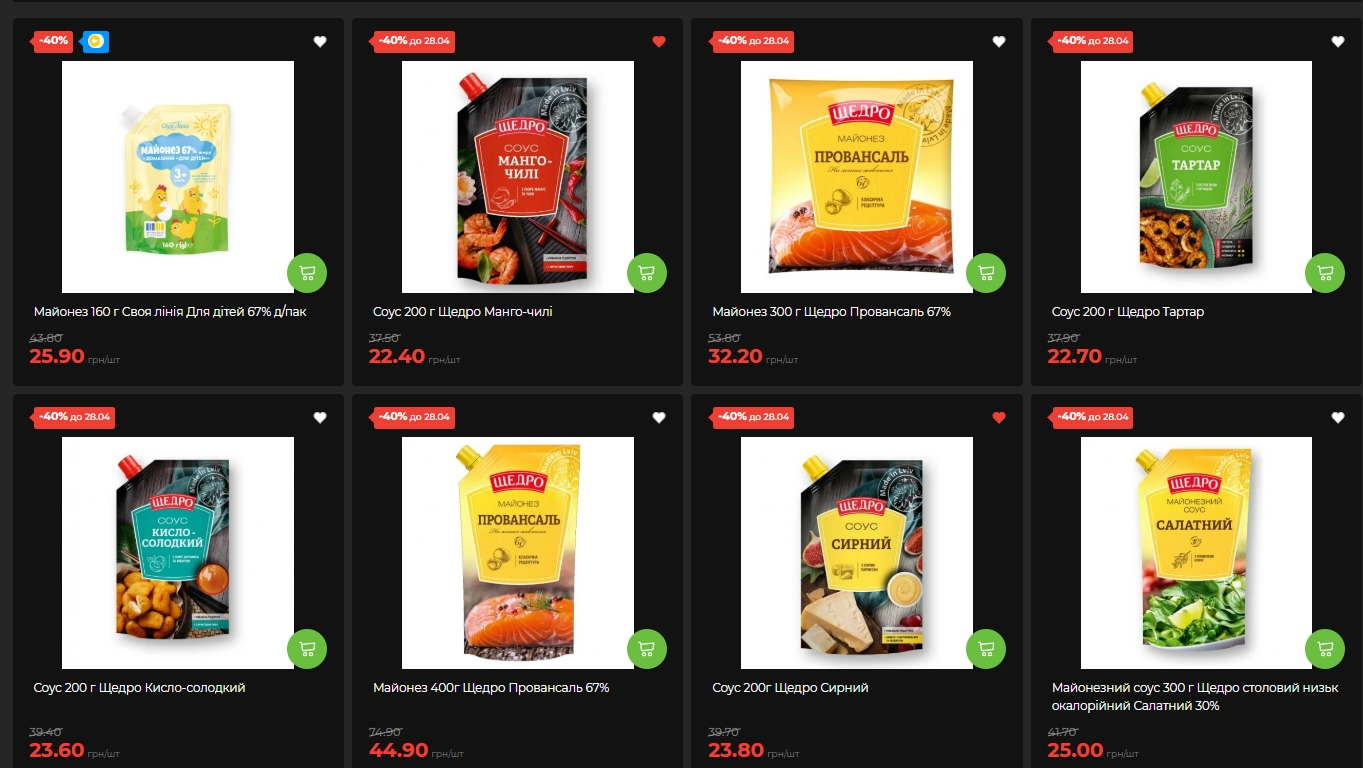 У бакалійному відділі вирізняється ціла лінійка соусів і майонезів "Щедро" зі знижкою мінус 40% до 28 квітня. Майонез Провансаль 300 г — 32,20 грн замість 53,80 грн, 400 г — 44,90 грн замість 74,90 грн. Соуси Манго-чилі, Тартар, Кисло-солодкий і Сирний — по 22,40-23,80 грн замість 37,50-39,70 грн.