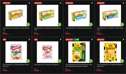 Глазуровані сирки "Ферма" — вишня-черешня, згущене молоко та ваніль — по 11,90 грн замість 17,80 грн (-33%). Йогурти "Злагода" 0,75 кг — малина-полуниця та Смузі Манго-Банан-Льон — 42,50-48,50 грн замість 62,90-71,50 грн (-32%). Масло "Яготинське" 82,5% солодковершкове, 180 г — 87,90 грн замість 116 грн (-30%).