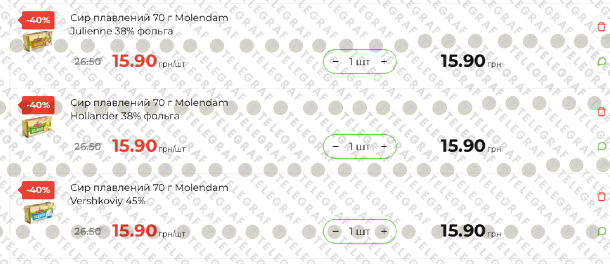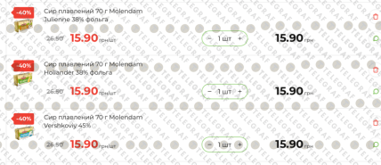Найбільшу знижку отримала лінійка плавлених сирів Molendam (70 г). Тепер будь-який смак із серії коштує 15,90 грн, тоді як стара ціна становила 26,50 грн: