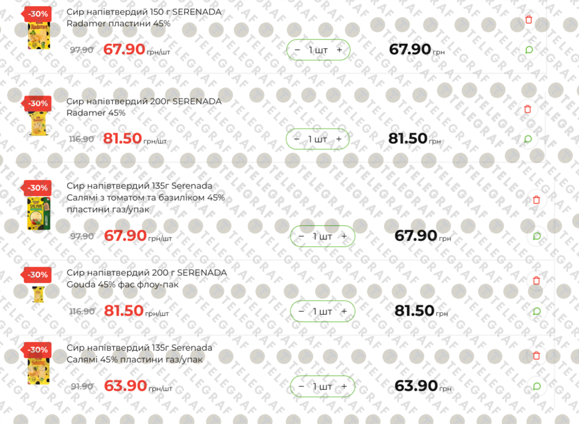 - Сир Radamer (пластини, 150 г): нова ціна 67,90 грн (було 97,90 грн).