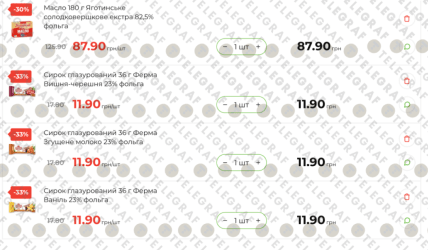- Сирки глазуровані "Ферма" (36 г, 23% жирності): ціна впала на 33%. Тепер сирки зі смаком ванілі, згущеного молока або вишні-черешні коштують лише 11,90 грн (замість 17,80 грн).