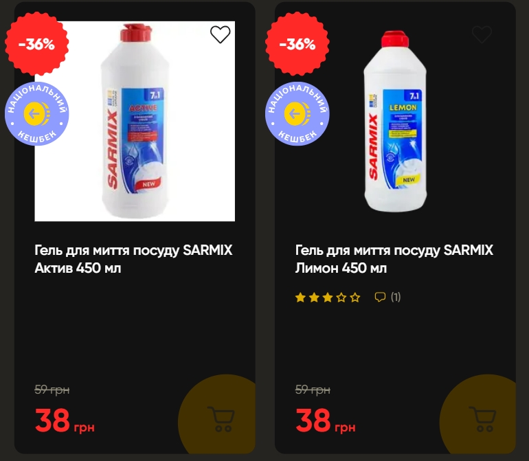 У категорії засобів для прибирання теж є на що звернути увагу. Гель для миття посуду SARMIX у двох варіантах — "Лимон" та "Актив" — продають по 38 гривень замість 59, знижка 36%. Засіб для миття дитячого посуду Satin Natural Balance 750 мл подешевшав з 59 до 39 гривень (-34%), а засіб Sila STOP ЗАПАХ для підлоги і поверхонь — з 109 до 77 гривень (-29%). Набір "Антижир" від GALAX у форматі 2х500 г коштує 104 гривні замість 149.