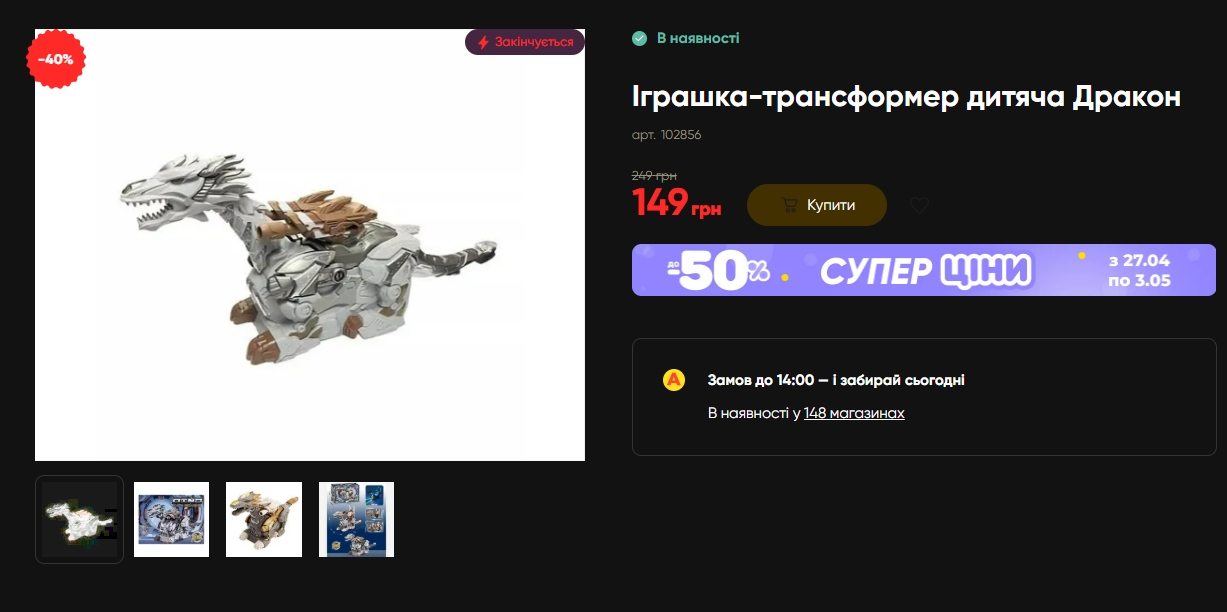У дитячому відділі цього тижня розпродаж доволі широкий. Іграшка-антистрес з рідиною всередині впала в ціні з 55 до 29 гривень (-47%), іграшка-трансформер "Дракон" — з 249 до 149 гривень (-40%). Набір ігровий "Хиткий офіціант" коштує 119 гривень замість 199, набір посуду "Морквинка" на п'ять предметів — 179 гривень замість 299. Лялька-пупс у костюмі подешевшала з 77 до 49 гривень, набір магнітів DoDo Study English — з 77 до 49 гривень.