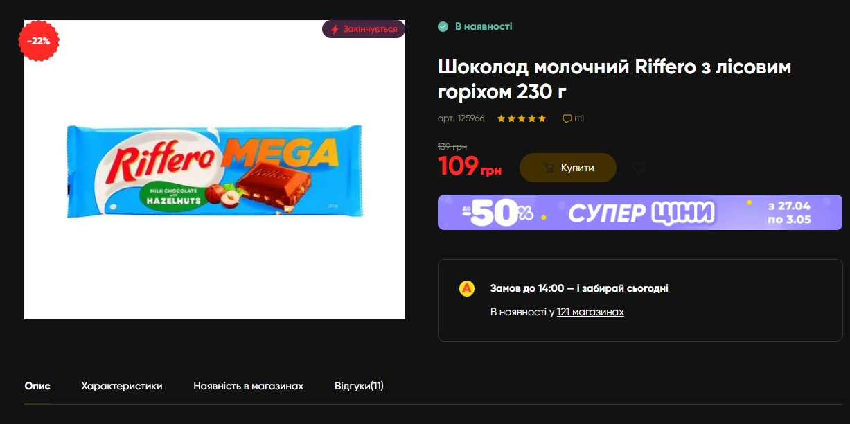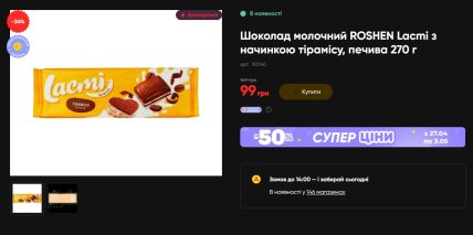 Шоколад ROSHEN Lacmi з начинкою тірамісу 270 г продають за 99 гривень замість 149 — знижка 34%. Набори шоколадних цукерок "Happy Easter" та "From the heart Праліне" подешевшали на 39%: перший коштує 39 гривень замість 64-х, другий — 54 гривні замість 88-ми. Батончик Kitkat Chunky White 40 г можна взяти за 24 гривні замість 34-х, крекер ТУК зі смаком сиру 100 г — за 38 гривень замість 56.