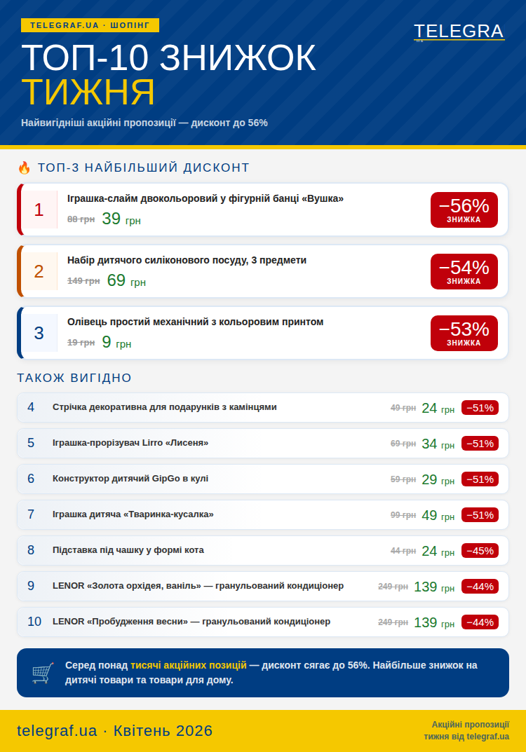 Серед більш як тисячі акційних позицій виділяються товари з особливо відчутним дисконтом. Ось десятка найвигідніших пропозицій тижня: