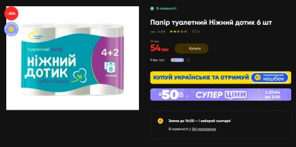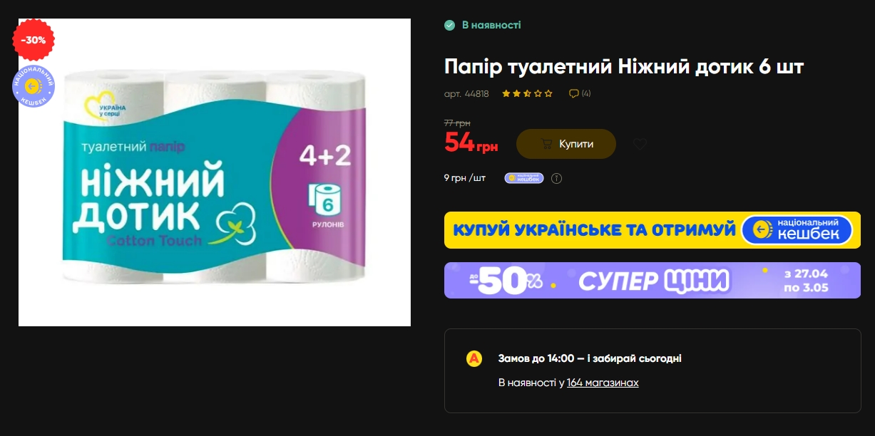 Туалетний папір теж потрапив до акції: "Ніжний дотик" шість штук — з 77 до 54 гривень, сірий "Новий Київ-500" — з 39 до 28 гривень.
