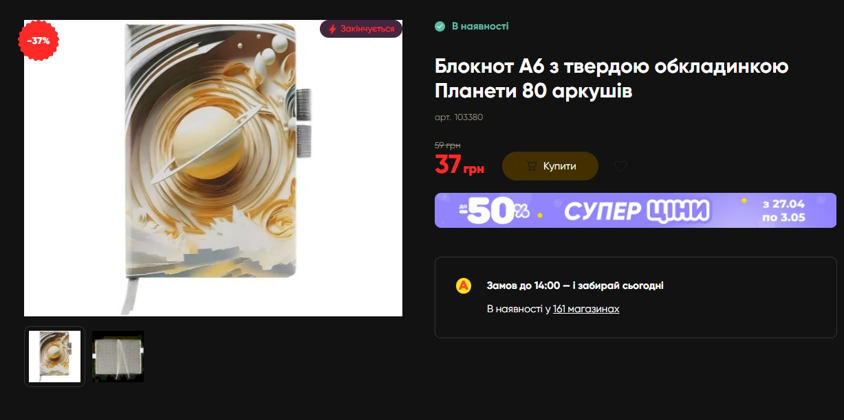 Серед канцтоварів особливо виділяються блокноти: А6 "Планети" з твердою обкладинкою — мінус 37%, з 59 до 37 гривень; А5 з обкладинкою з екошкіри — мінус 39%, з 77 до 47 гривень; дитячий квадратний з кольоровими сторінками — мінус 38%, з 24 до 15 гривень. Маркер перманентний SuperSlim чорний продають за 5,50 гривні замість 9.