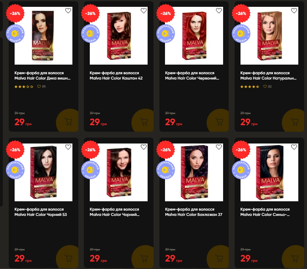 У косметичному відділі активно розпродають фарбу для волосся Malva Hair Color у різних відтінках — знижка 26% на кожну, ціна 29 гривень замість 39. Контур-хайлайтер Lovit 2в1, гель-лак Lovit та дзеркало Lovit Bloom коштують по 49 гривень замість 69. Туш Lovit Curl подешевшала з 39 до 29 гривень.
