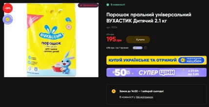 Серед засобів для прання вирізняється кілька позицій. Пральні капсули Pro WASH "Альпійська свіжість" 10 штук подешевшали на 40% — з 99 до 59 гривень. Порошок "ВУХАСТИК Дитячий" на 2,1 кг можна взяти за 195 гривень замість 275, а капсули PINA Classic на 11 штук — за 98 гривень замість 139. Набір кубиків для бачка унітазу Bref "Дуо-Куб" зі знижкою 31% коштує 109 гривень, набір блоків Bref "Сила Актив Лимон" — 159 гривень замість 219.
