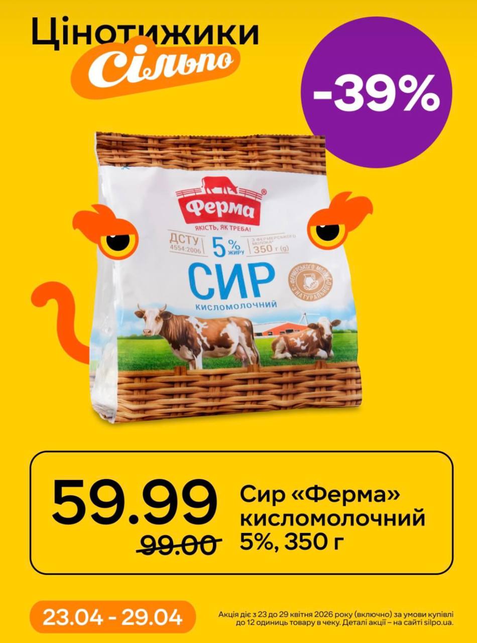 Згідно з умовами акції, сир торгової марки "Ферма" (5% жирності, упаковка 350 г) зараз коштує значно дешевше. Замість звичної ціни у 99,00 грн, покупці можуть придбати його лише за 59,99 грн. Таким чином, економія становить солідні 39%.