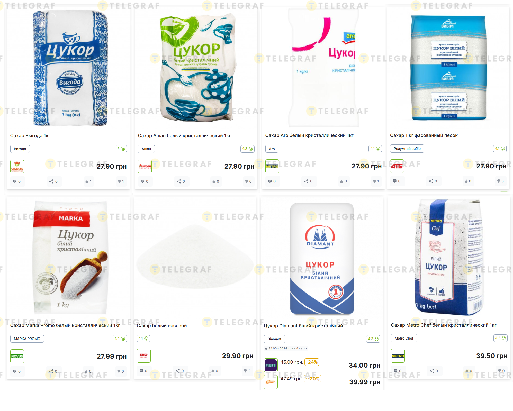 • Цукор Diamant білий кристалічний (Maudau) — 34,00 грн (знижка -24%, раніше 45,00 грн); (Сільпо) — 39,99 грн (знижка -20%, раніше 47,49 грн)