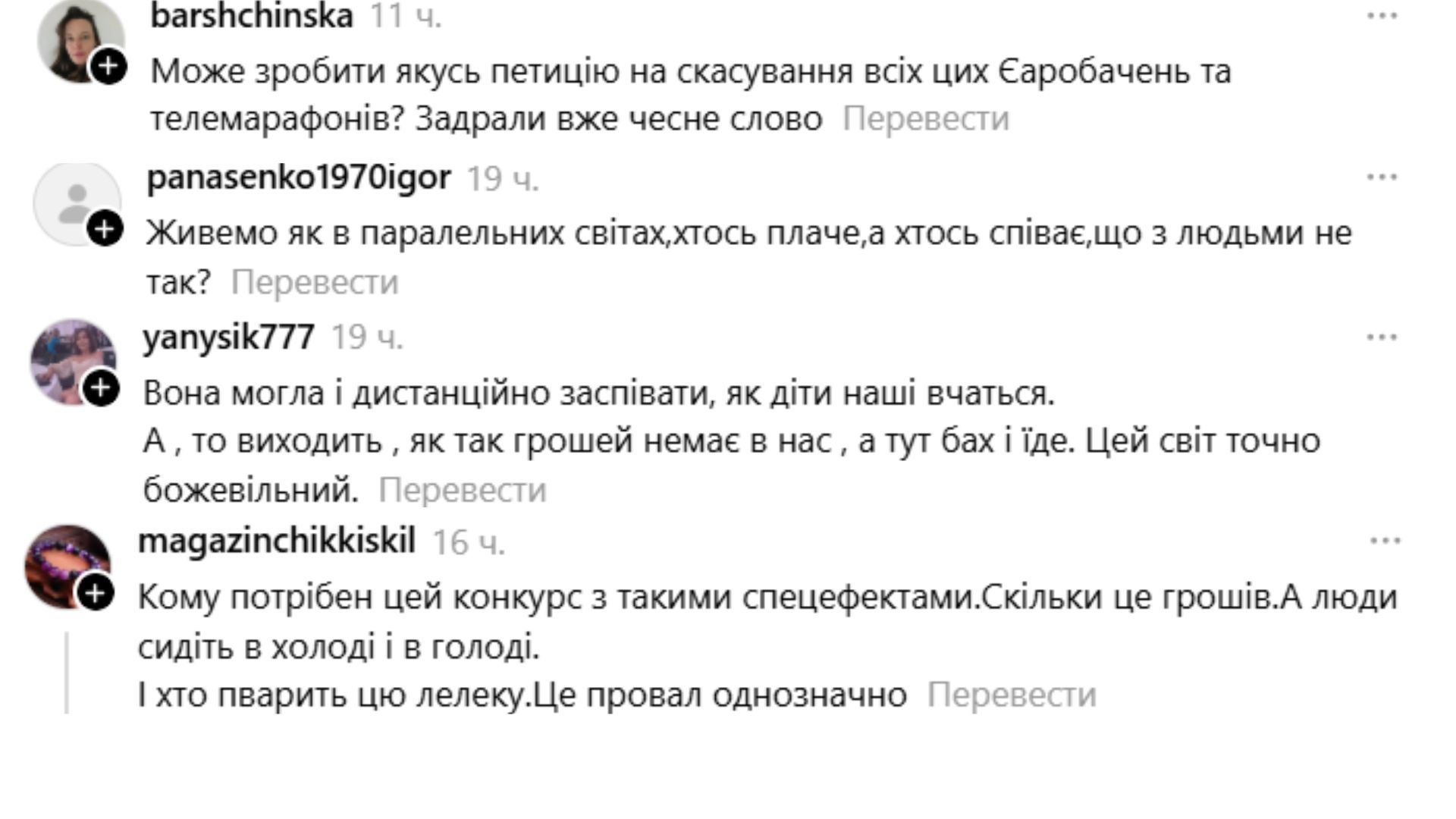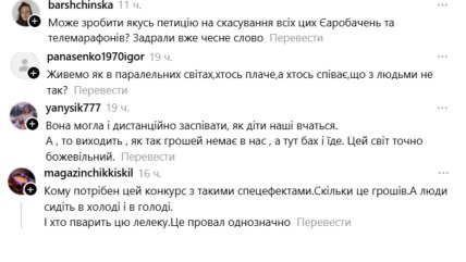 • "Кому потрібен цей конкурс з такими спецефектами. Скільки це грошей. А люди сидять в холоді і в голоді";