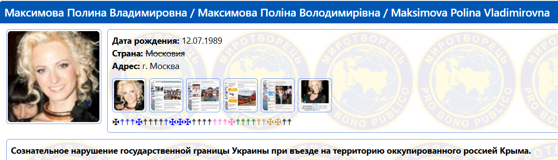 - Її ім’я внесено до бази "Миротворець" через візит до анексованого Криму