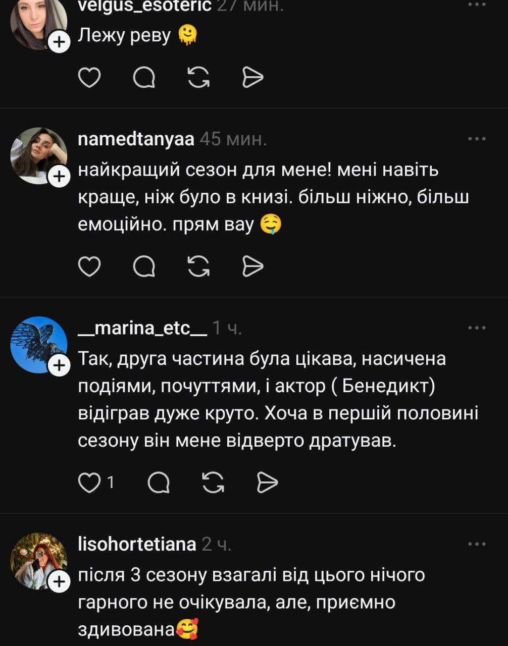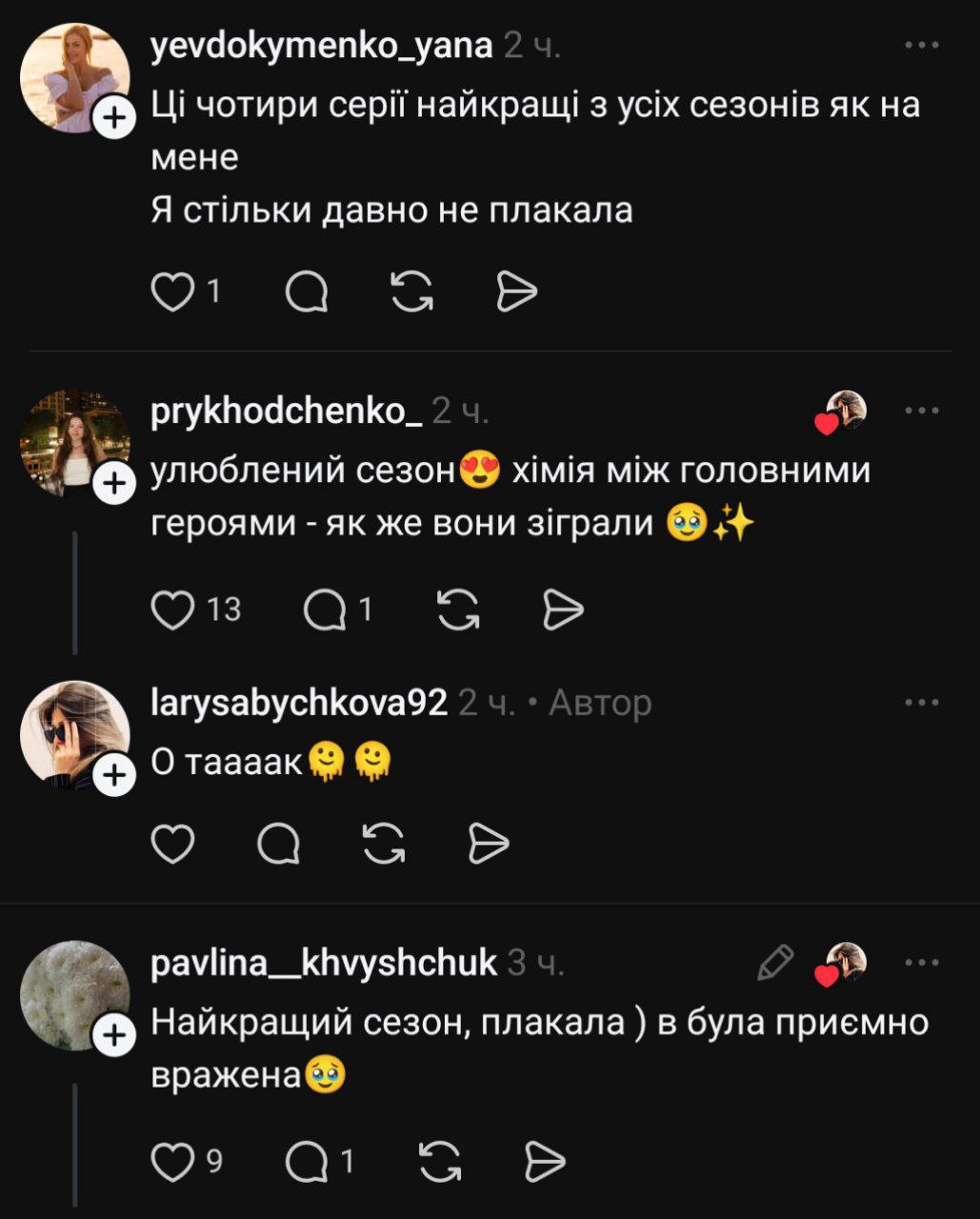 Багато українців уже встигли переглянути завершальні серії та поділилися враженнями. Частина аудиторії назвала четвертий сезон своїм улюбленим, підкресливши хімію між персонажами, напружену інтригу та вивірену динаміку: