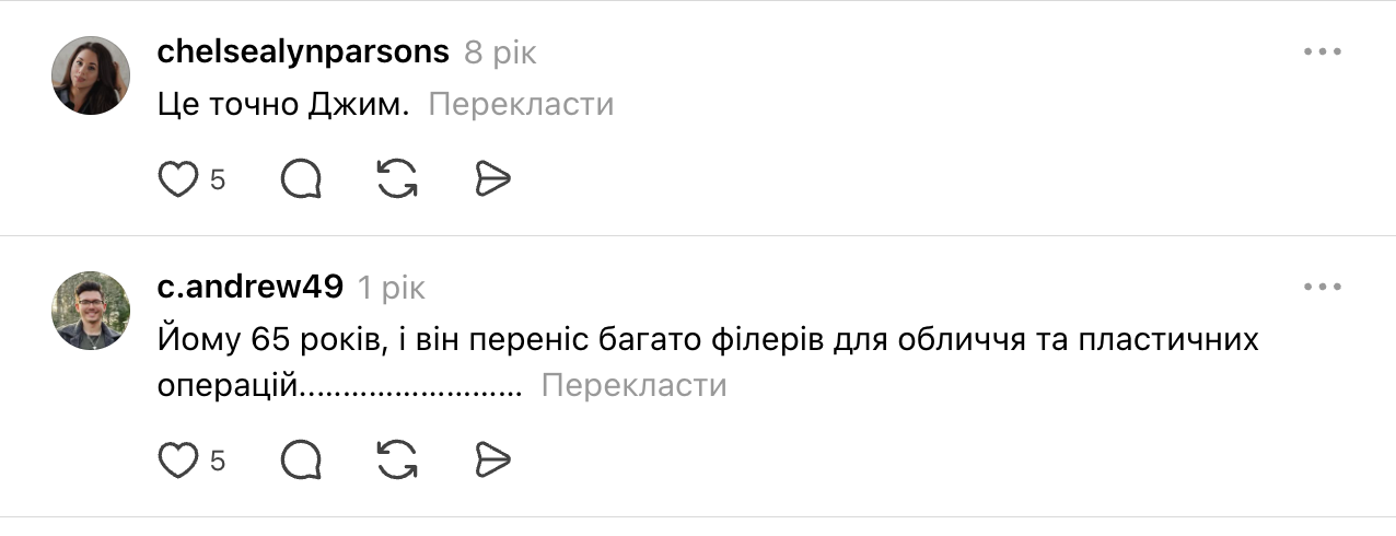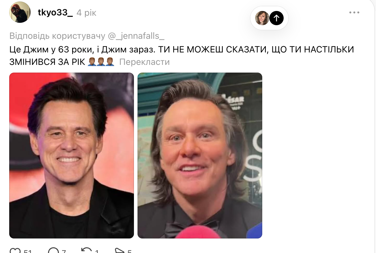 Інші користувачі не вірять у "підміну" і пишуть, що це Джим Керрі, просто актор переборщив з ботоксом: