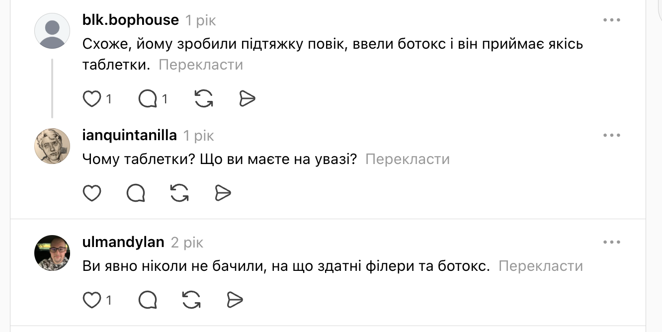 - "Схоже, що він робив підтяжку повік, ботокс і приймає якісь пігулки".