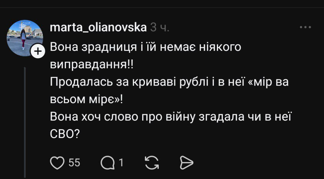 Українці в мережі Threads висловилися з приводу нового концерту зрадниці в Москві, зазначивши, що вона продалася за криваві рублі й жодного разу не згадала, що її рідну країну щодня обстрілюють.