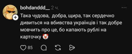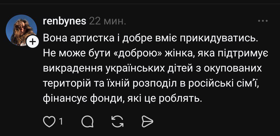 • "Вона артистка і добре вміє прикидатися. Не може бути "доброю" жінка, яка підтримує викрадення українських дітей з окупованих територій та їх розподіл у російські сім’ї";