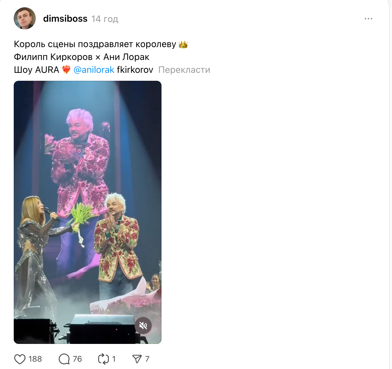 На концерт Ані Лорак у Москві прийшов її друг Філіп Кіркоров, особисто подарувавши на сцені величезний букет та привітавши співачку із презентацією нової програми. Він зазначив, що шоу Лорак "світового рівня", але в мережі висміяли цю велич та зовнішність артистів, які неодноразово вдавалися до пластичної хірургії.