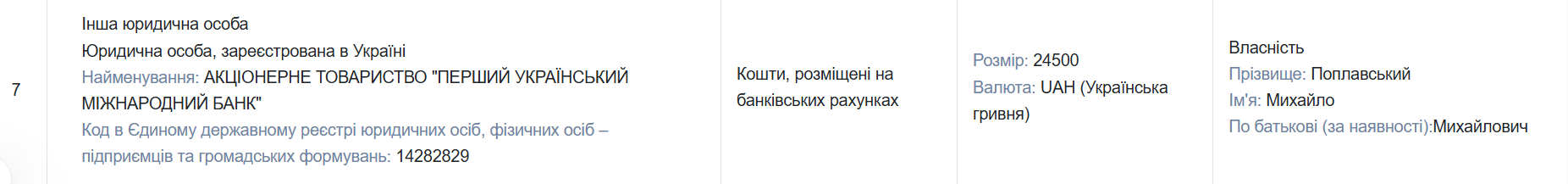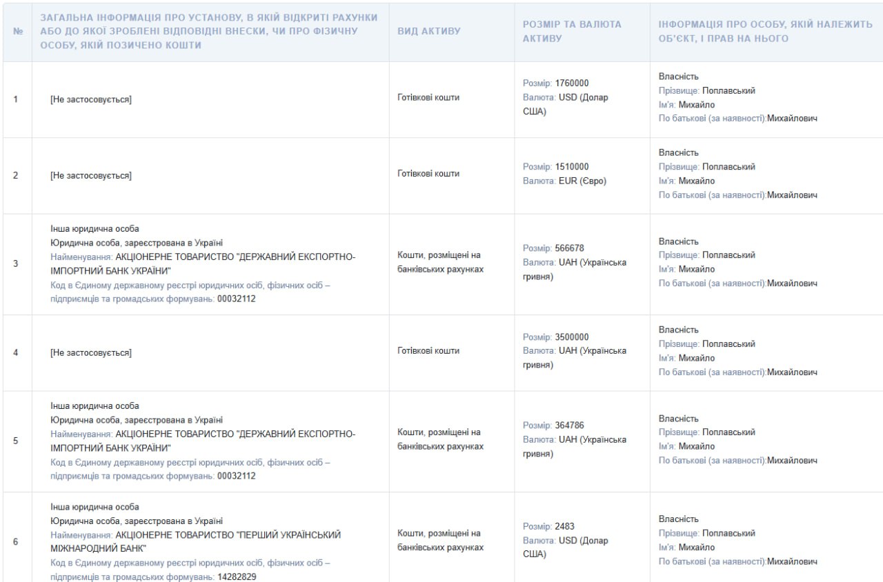 Зокрема, Поплавський задекларував: 566 678 гривень на рахунках у банках; 364 786 гривень на інших банківських рахунках; 2 483 долари США, які також зберігаються на рахунках і ще 24 500 гривень. Окрім цього, у готівкових заощадженнях задекларовано 1 510 000 євро.