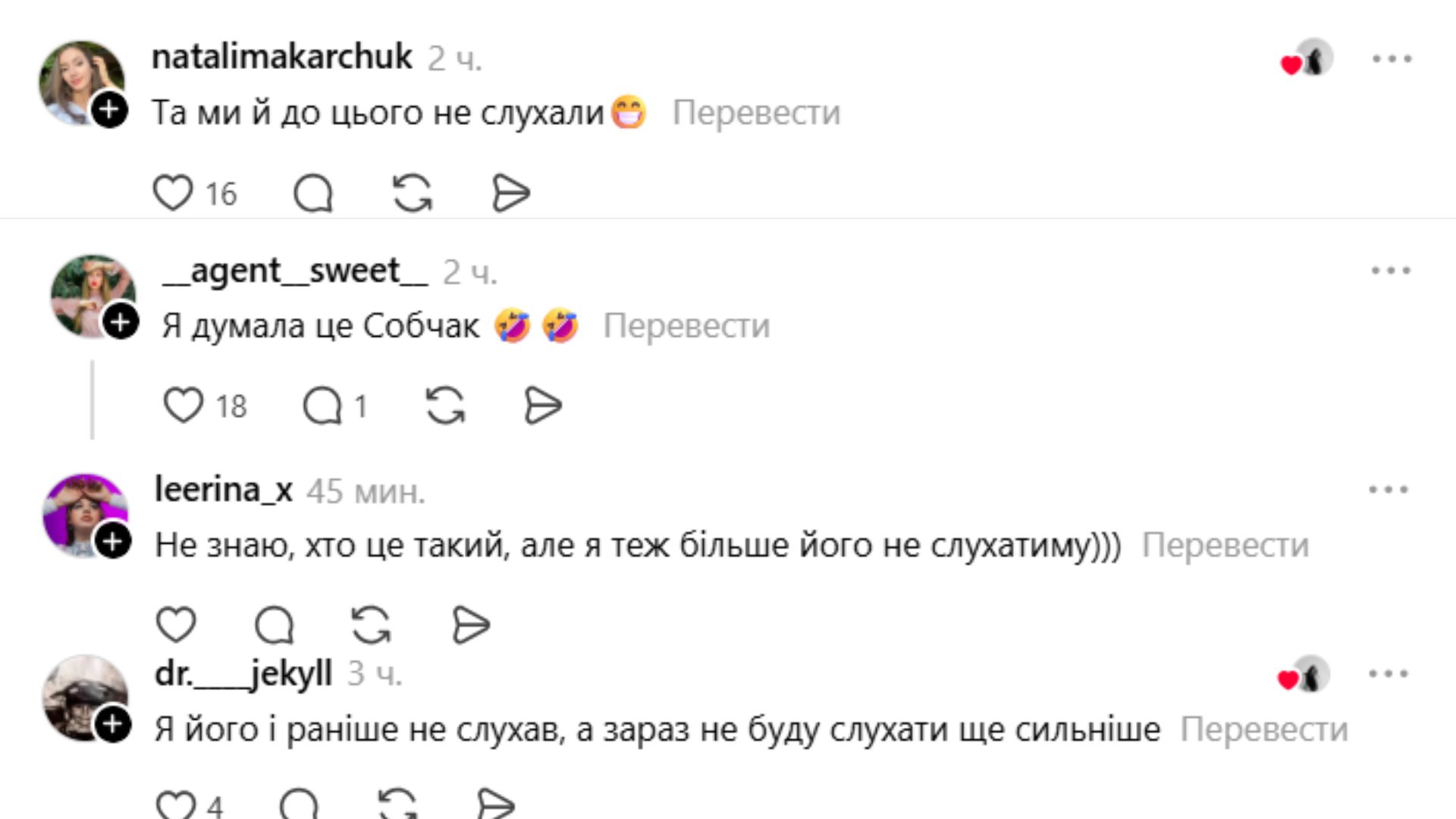 Зокрема, відреагували: музикант і військовослужбовець Коля Сєрга, комік Артем Дамницький, співак Артем Пивоваров, інтерв'юер Анатолій Анатоліч, екс "холостяк" і ветеран війни Олександр "Терен":