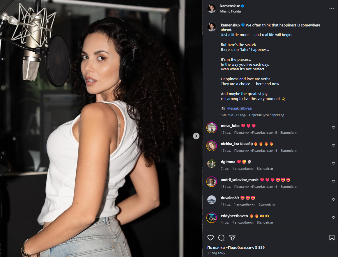 38-річна виконавиця, яка відмовилася від української мови у своєму блозі в Instagram, опублікувала новий пост. У ньому Каменських англійською мовою пофілософствувала про щастя та життя. Судячи з геотегу зірки, зараз вона знаходиться у Маямі (Флорида, США).