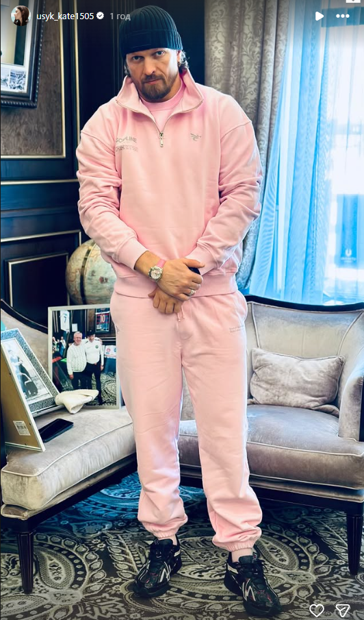 На іншій світлині боксер позує у спортивному костюмі світло-рожевого кольору та чорній шапці. На правій руці у чемпіона — годинник з яскравим рожевим ремінцем.