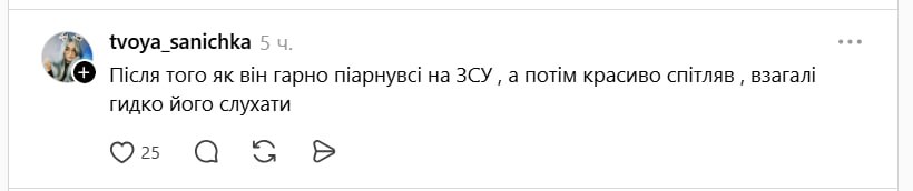 - "Після того, як він гарно піарнувся на ЗСУ, а потім гарно спетляв, взагалі гидко його слухати".