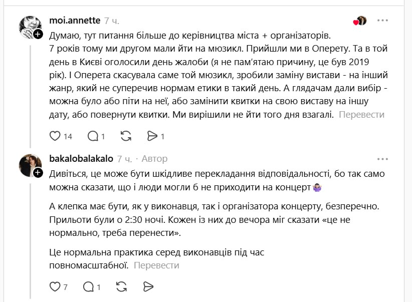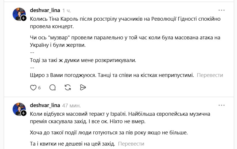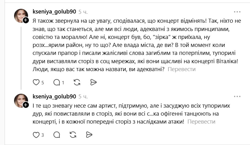 - "Ніхто не знав, що так станеться, але ми всі люди, адекватні з якимись принципами, совістю та мораллю! Але ні, концерт був, бо ж "зірка" приїхала";