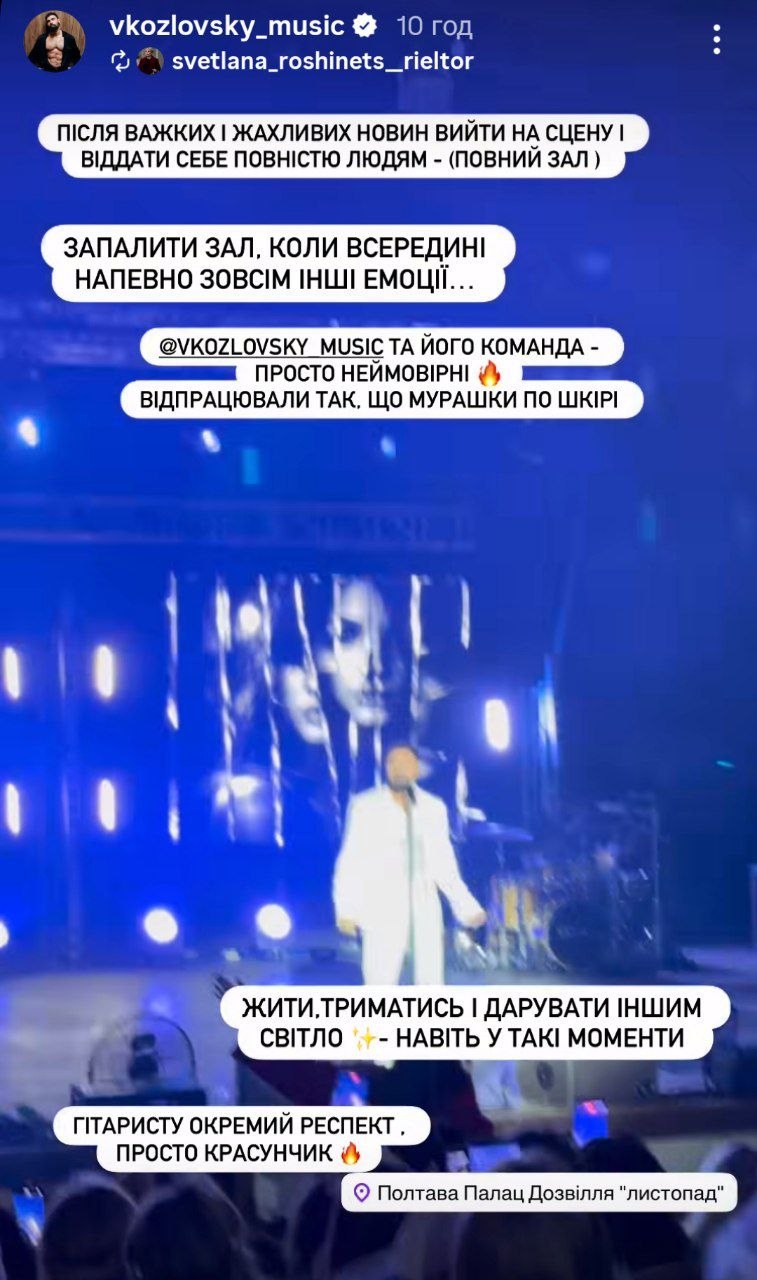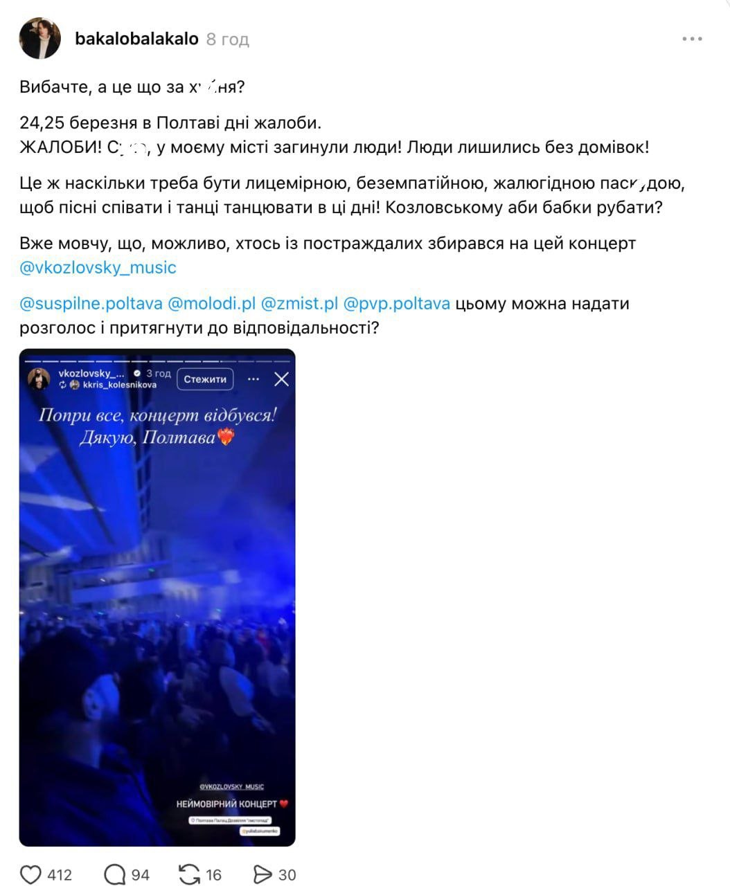Український співак Віталій Козловський провів у Полтаві концерт та нарвався на критику. Захід відбувся попри оголошену жалобу у пам'ять про жертв російської атаки в ніч проти 24 березня.