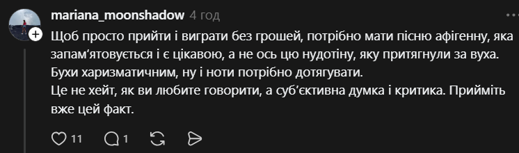Щоб просто прийти і виграти без грошей, потрібно мати пісню афігенну, яка запамʼятовується і є цікавою, а не ось цю нудотіну, яку притягнули за вуха. Бути харизматичним, ну і ноти потрібно дотягувати. Це не хейт, як ви любите говорити, а субʼєктивна думка і критика. Прийміть вже цей факт