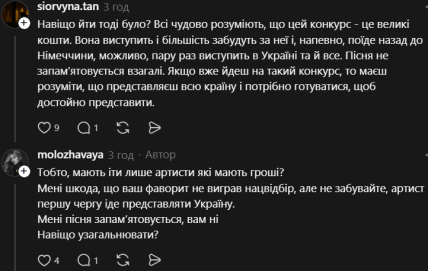Поки команда артистки шукає ресурси, українці в мережі розділилися на два непримиренні табори у threads. Частина аудиторії стала на захист виконавиці, наголошуючи, що Євробачення не має бути "конкурсом гаманців". Прихильники вважають несправедливим те, що участь у престижному шоу стає доступною лише для заможних артистів або тих, хто має потужних спонсорів.