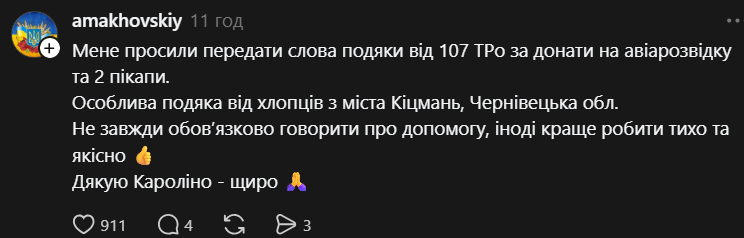 - Мене просили передати слова подяки від 107 ТРо за донати на авіарозвідку та 2 пікапи. Особлива подяка від хлопців з міста Кіцмань, Чернівецька обл. Не завжди обовʼязково говорити про допомогу, іноді краще робити тихо та якісно 👍 Дякую Кароліно — щиро 🙏