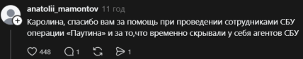 Українські користувачі миттєво відреагували на пост, влаштувавши артистці масштабний тролінг: люди масово дякують Кароліні за "фінансування ЗСУ" та "співпрацю з українськими спецслужбами". Мета такого флешмобу очевидна — створити зрадниці якомога більше проблем у країні-агресорці, де за "допомогу Україні" загрожують реальні терміни.