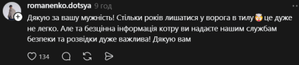 - Дякую за вашу мужність! Стільки років лишатися у ворога в тилу🤯це дуже не легко. Але та безцінна інформація котру ви надаєте нашим службам безпеки та розвідки дуже важлива! Дякую вам