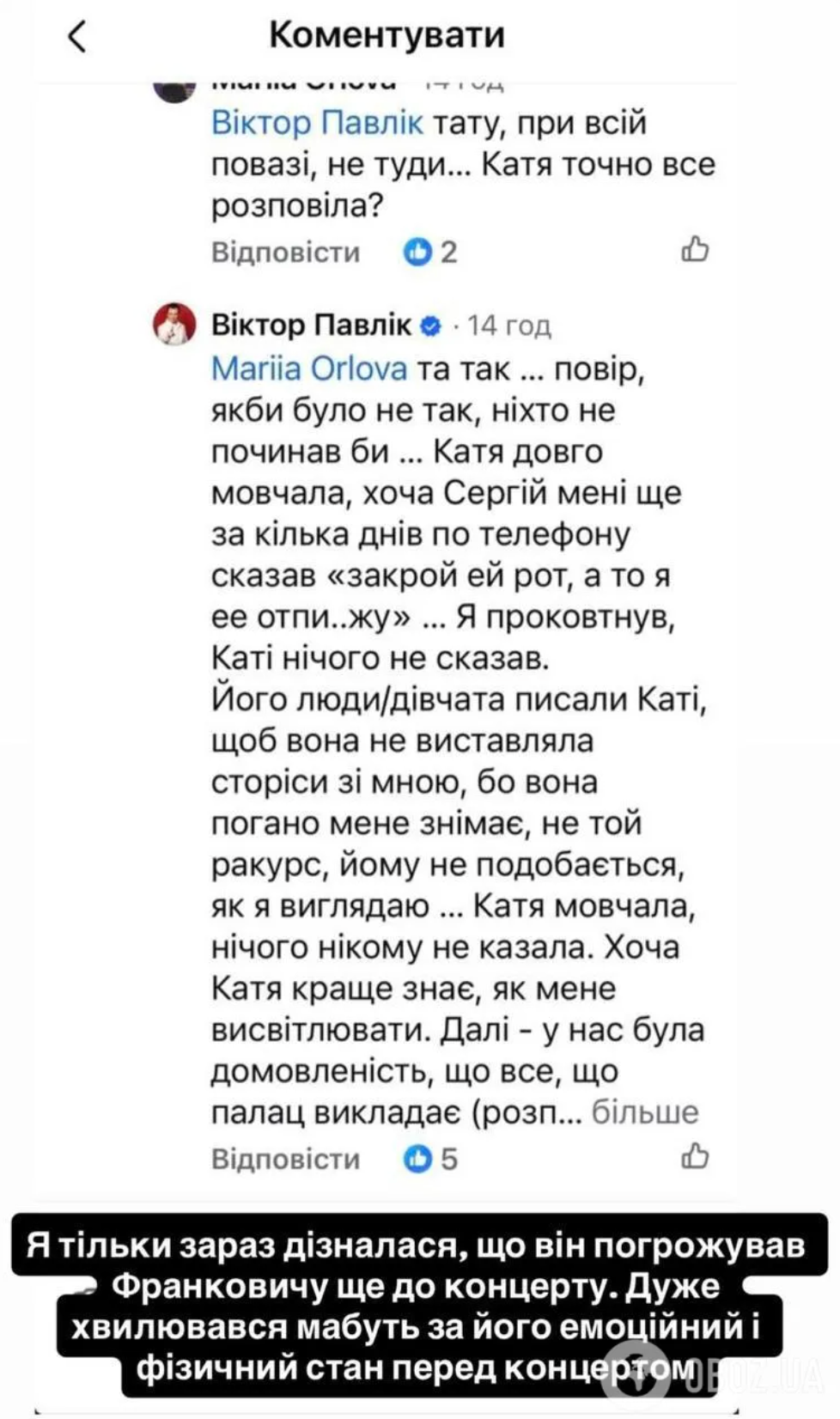 Сам артист розкрив нові деталі скандалу, зазначивши в коментарях, що Сергій Пермян ще за кілька днів до концерту зв’язувався з ним і в грубій формі змушував "закрити рота" його дружині Катерині, а в іншому випадку погрожував застосувати фізичну силу. Павлик не розповідав дружині про такі погрози.