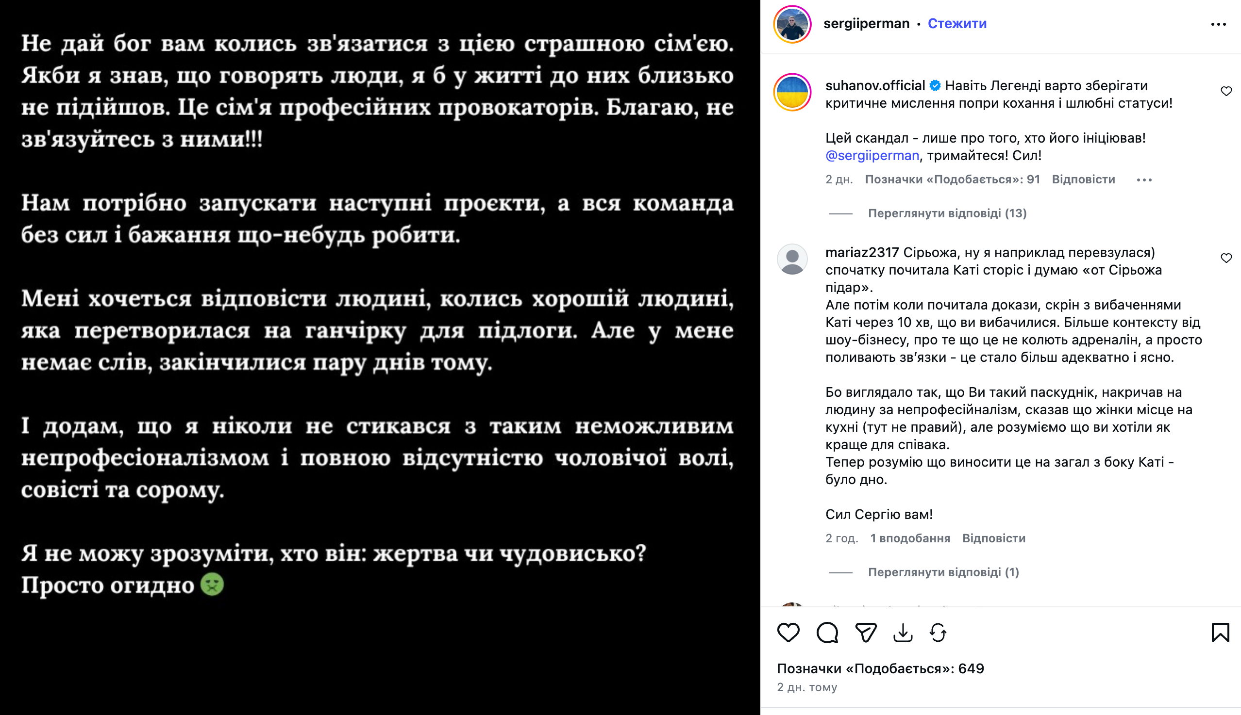 Коли це почали "розносити" ЗМІ у своїх соціальних мережах Сергій Перман написав, що Катерина Репяхова та Віктор Павлик є "страшною родиною" та професійними провокаторами.