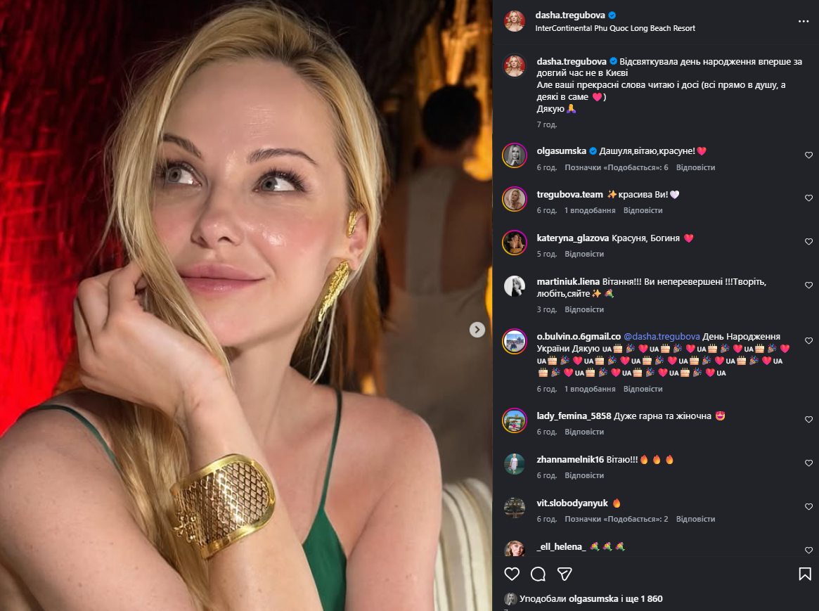 На своїй сторінці в instagram зірка виклала пост з кількома світлинами, в якому подякувала шанувальникам за привітання та зазначила, що цього року вперше відзначила подію не у рідному Києві. Судячи з геотегу, Трегубова полетіла у В'єтнам та заселилася в елітному готелі InterContinental Phu Quoc Long Beach Resort.