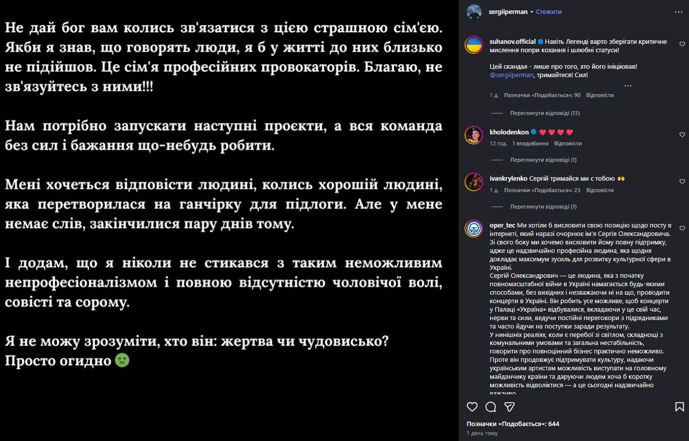 Скандал навколо виступу Віктора Павліка, що відбувся 21 березня, досі не вщухає. Поки мережа обговорює деталі інциденту, Перман додав іронії у цю історію. 28 березня у своїх Instagram-сторіз продюсер опублікував нове фото.