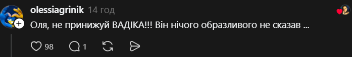 "Оля, не принижуй Вадіка! Він нічого образливого не сказав", "Вона в моїх очах дуже впала", "Дуже смішно… аж соромно", — пишуть обурені підписники в коментарях.