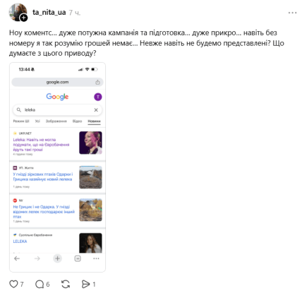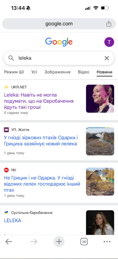 До публікації вона додала скрін результатів пошуку. За запитом "leleka" у Google — лише одна новина про артистку, яка представить Україну на "Євробаченні". Водночас більшість результатів стосується пари лелек — Грицика та Одарки.